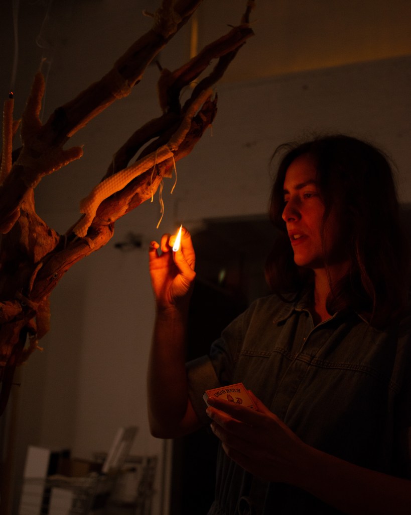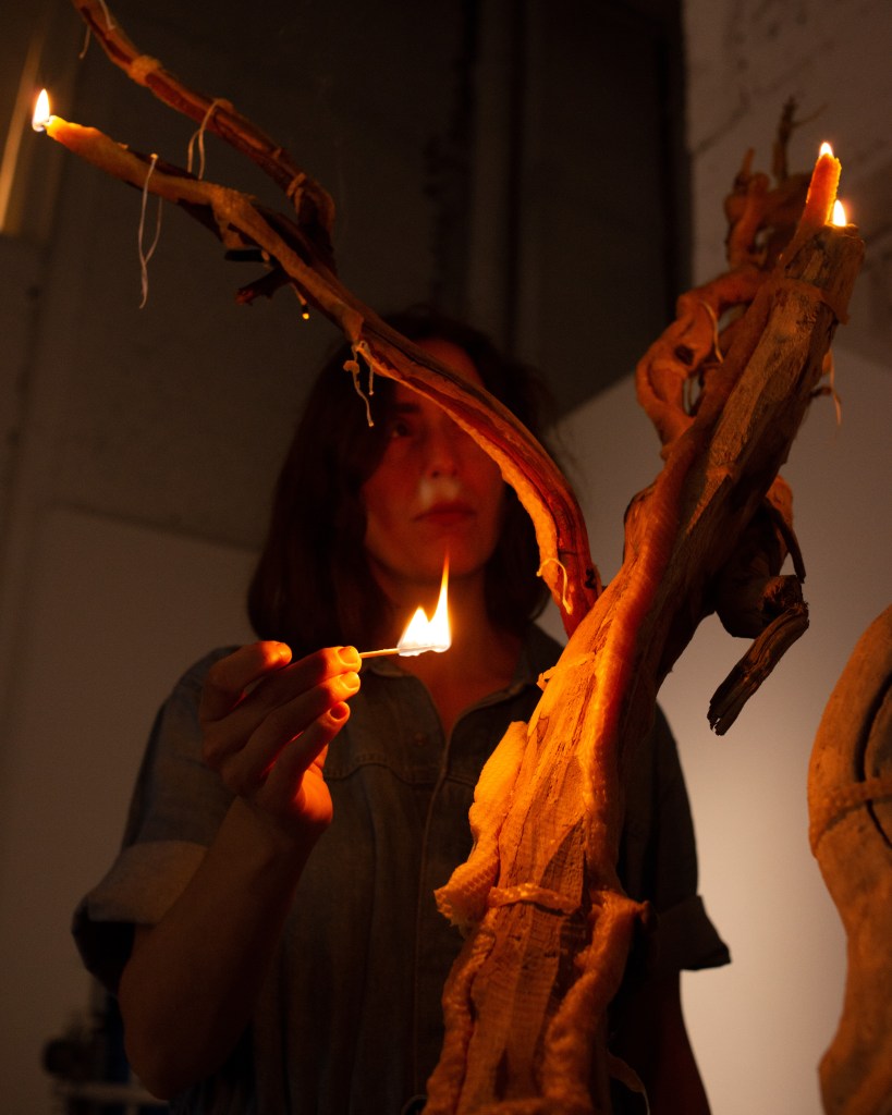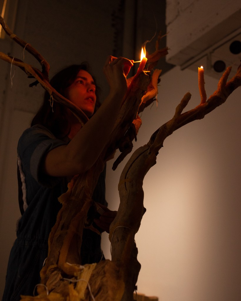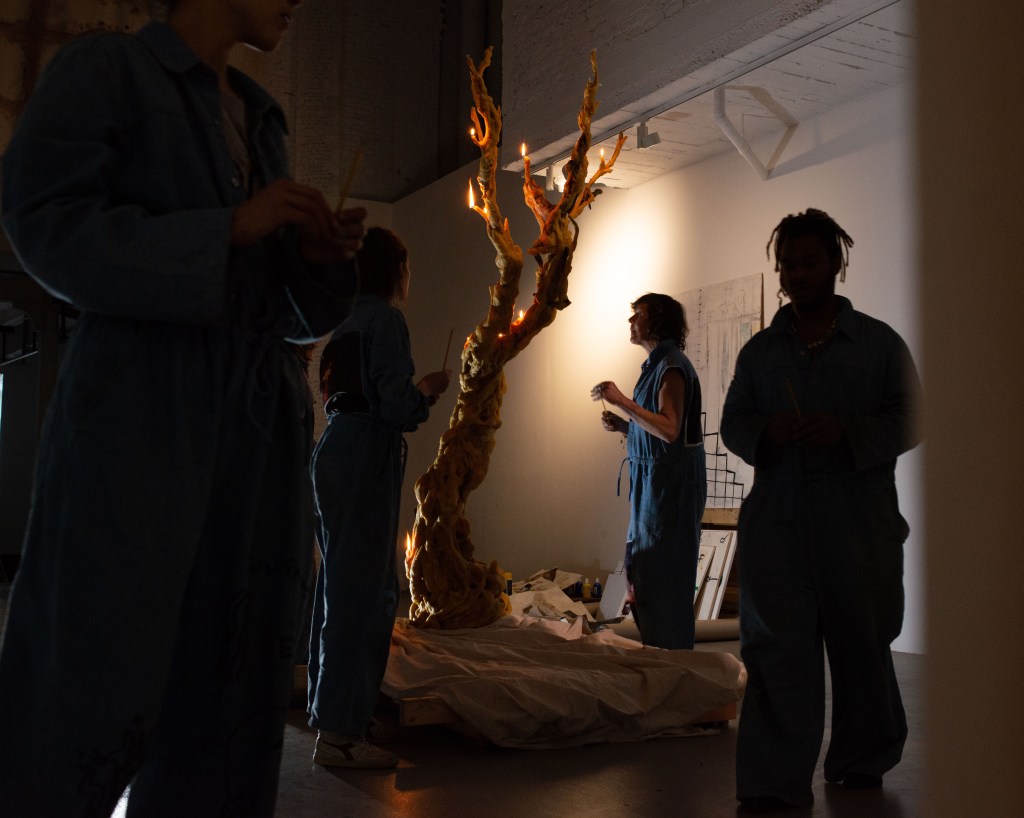 ‘This Is What You Came For’ culminated into a procession through Brussels with a sculpture of a beeswax tree mounted on copper, carried by the whole team and lit in front of Bozar. “A tree covered in beeswax, with formless, melted contours. Sculpted by the flames, now extinguished, but present in the traces they leave in the exhibition. Traces of a ritual that took place on the evening of the opening when the wax tree was paraded through the streets of Brussels, from the CENTRALE to Bozar, where it was lit on fire. The tree was carried by members of The BARЯA Movement, a collective of artists, long time collaborators and former students that has grown organically over the last few years and fits within her practice.” ©Bozar