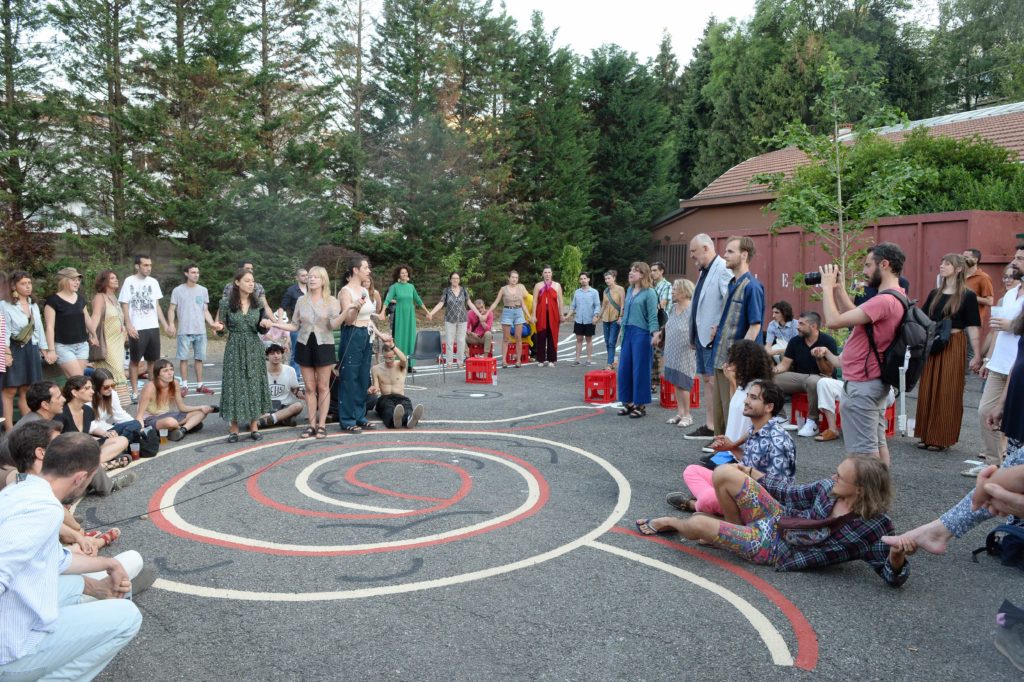 From Fondazione Pistoletto: The day closed with the performance by BARЯA Movement entitled Caro Cervo. The fluid art collective based in Belgium was invited to take part in a residency to get to know Cittadellarte and produce a new performance work. On this journey, full of meaningful encounters, they were guided by the UNIDEE Residency Programs team. Their practice is rooted in regenerative art, which focuses on processes of creation restored and revitalised by art itself. Their work Caro Cervo was an open invitation to the whole of Cittadellarte, a collective performance that aimed at triggering a process of deeper relationship with each other and with the river Cervo. Two weeks before Arte Al Centro, BARЯA Movement invited those who work and ‘live’ at Cittadellarte to collect and ‘look after’ one of the stones laid by the collective on the courtyard inside the Foundation. These stones – chosen by drawing inspiration from a sound recording of the stream bank – acted as a bridge between people and the Cervo, thus creating a link between man and nature while at the same time giving voice to the river. The performance was collective but proved to be intimate, profound and introspective: Arte al Centro closed with an inspiring look at the bond and relationship between the individual, society and nature, amidst smiles, emotions, handshakes, hugs and an explosive energy that first started with Michelangelo Pistoletto and then spread like wildfire through the art and creativity of everyone, including the public.