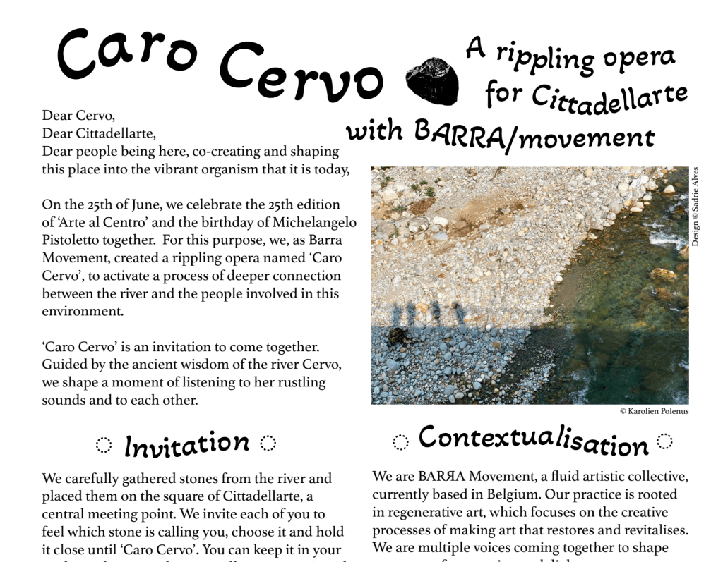 Caro Cervo was an open invitation to the whole of Cittadellarte: a collective performance that aims to trigger a process of a deeper relationship with each other and with the river Cervo.