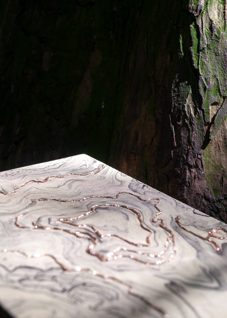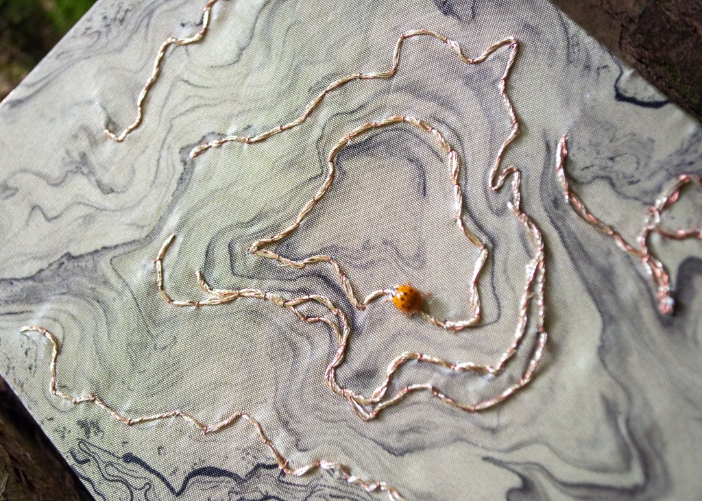 Suminagashi, Copper wire, Gold embroidery on Textile and mounted on Wood ;